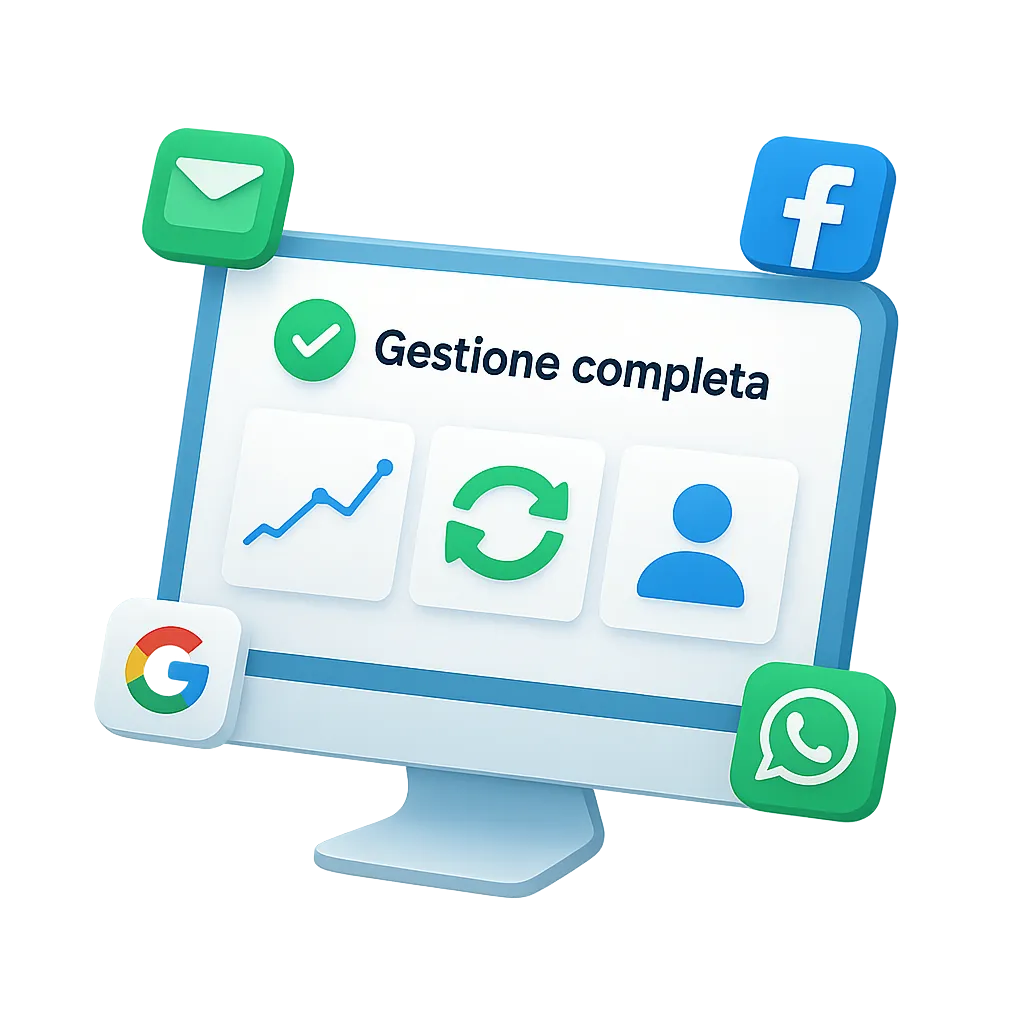 il nostro team si occuperà per te della gestione di campagne pubblicitarie, automazioni, CRM, comunicazione e recensioni. In questo modo puoi concentrarti solo sul tuo lavoro, mentre noi pensiamo a far crescere clienti e fatturato.
